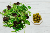 Green salad, fresh leaves in white plate. Top view.