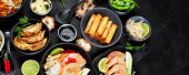 Różne dania kuchni azjatyckiej na czarnym tle, widok z góry. Azjatyckie jedzenie. Odbiór. Panorama, sztandar