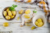 Zdjęcie "Młode gotowane ziemniaki na talerzu z pietruszką i cebulą na desce. Białe tło. Widok z góry." może być wykorzystywane do celów osobistych i komercyjnych zgodnie z warunkami zakupionej licencji Royalty-free. Obraz jest dostępny do pobrania w jakości wysokiej rozdzielczości do 5760x3840.