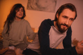 Smutna kobieta siedząca plecami do siebie z aseksualnym chłopakiem w domu, sztandar