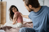 niewyraźny mężczyzna dotykając rozczarowany dziewczę w piżama na łóżko