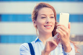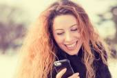 szczęśliwy, radosny, dziewczyna, podekscytowany wiadomości tekstowe na telefon komórkowy