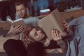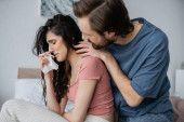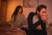 niezadowolona kobieta siedzi w pobliżu zamazany chłopak na łóżku w domu