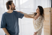 obojętny mężczyzna siedzi w pobliżu zamazanej dziewczyny na łóżku wieczorem