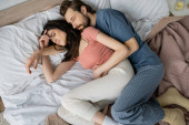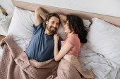 Zdjęcie "Widok z góry niezadowolonej kobiety przechodzącej przez ramiona i patrzącej na chłopaka w łóżku w domu " może być wykorzystywane do celów osobistych i komercyjnych zgodnie z warunkami zakupionej licencji Royalty-free. Obraz jest dostępny do pobrania w jakości wysokiej rozdzielczości do 5760x3840.