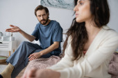 Niezadowolony mężczyzna w piżamie rozmawia z zamazaną dziewczyną siedząc na łóżku