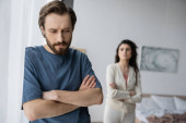 Smutna kobieta siedząca blisko rozmazanego chłopaka rozmawiającego w sypialni