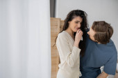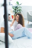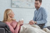Opiekun człowiek trzyma szklankę wody w pobliżu dziewczyny z pigułek w sypialni