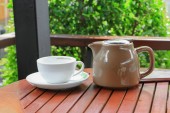 Kawa cappuccino z bliska na tle drewna