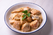 Indyk z sosem stroganowym. Stroganoff, stroganoff lub sos stroganoff jest wykonany z grzybów i sosu z kwaśnej śmietany