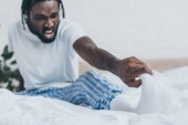 Przepełniony radością Afrykański Amerykanin z witiligo leżący rano na łóżku