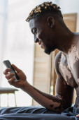 Muskularny Amerykanin z witiligo czytający zamazaną książkę na łóżku w domu