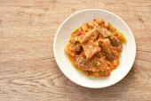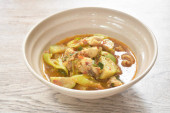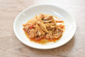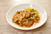 Głęboko smażona ryba mango z ananasem i chili w słodkim kwaśnym sosie na talerzu