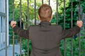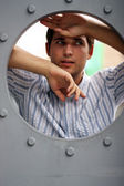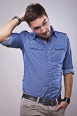 przystojny, młody człowiek w pobliżu starych drzwi metalowe