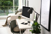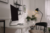 Przytulne miejsce pracy z komputerem, nowoczesnymi meblami i roślinami w domu