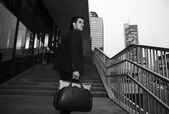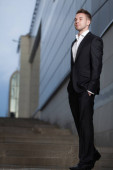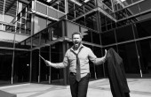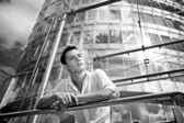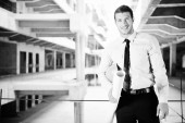 młody biznesmen w miejscu pracy. Fotografia czarno biała.