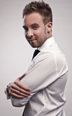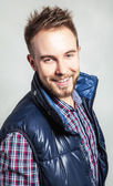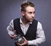 młody biznesmen posiadania słoik z monet