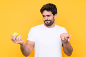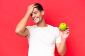młody biały człowiek z jabłkiem odizolowane na czerwonym tle mając wątpliwości i mylić wyraz twarzy