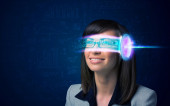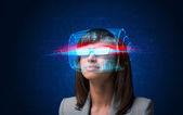 Młoda kobieta szuka z futurystyczne okulary high tech inteligentne