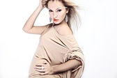 atrakcyjna blondynka w zielonej sukni. na białym tle.