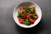 Pyszna, świeża sałatka grecka z serem feta, oliwkami, pomidorami i ogórkami na ciemnym, betonowym tle