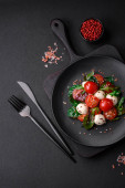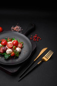 Pyszna, świeża sałatka grecka z serem feta, oliwkami, pomidorami i ogórkami na ciemnym, betonowym tle