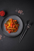 Pyszna, świeża sałatka grecka z serem feta, oliwkami, pomidorami i ogórkami na ciemnym, betonowym tle