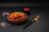 Pyszna, świeża sałatka grecka z serem feta, oliwkami, pomidorami i ogórkami na ciemnym, betonowym tle