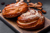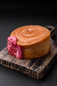 Okrągłe ciasto francuskie croissant z nadzieniem malinowym lub nowojorskie rolki na ciemnym tle betonu
