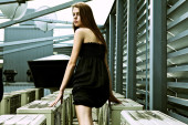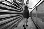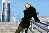 piękna blondynka w pobliżu budynku ze szkła