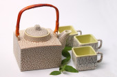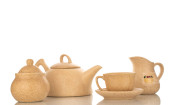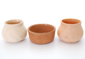 Ceramiczne kubki w różnych rozmiarach i kolorach. zestaw kieliszków i talerzy z ceramiki na szarym tle. Naczynia pokryte matową glazurą. Ceramiczne ręcznie robione