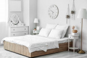 Wnętrze jasnej sypialni z łóżkiem, szufladami i oknem