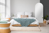 Zdjęcie "Wnętrze jasnej sypialni z łóżkiem, szufladami i oknem" może być wykorzystywane do celów osobistych i komercyjnych zgodnie z warunkami zakupionej licencji Royalty-free. Obraz jest dostępny do pobrania w jakości wysokiej rozdzielczości do 5760x3840.
