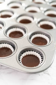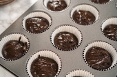 Zbieranie czekoladowego ciasta babeczkowego do wkładek babeczkowych.