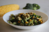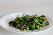 Brokuły z ciecierzycy smażone. Czosnek i brokuły wymieszać smażone z ciecierzycy. Wegańskie jedzenie ze zdrowym białkiem roślinnym. Strzał na białym tle