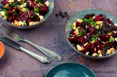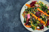 Sałatka z duszonej chard, buraki i marchewki z nasionami dyni. Wegetariańska koncepcja zdrowej żywności