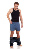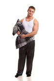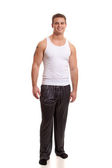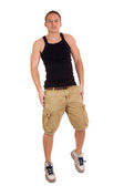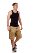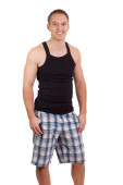 Zdjęcie "Young man in plaid shorts and tank top. Studio shot over white." może być wykorzystywane do celów osobistych i komercyjnych zgodnie z warunkami zakupionej licencji Royalty-free. Obraz jest dostępny do pobrania w jakości wysokiej rozdzielczości do 5760x3840.