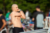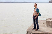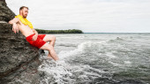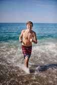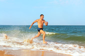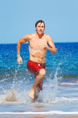 atrakcyjny mężczyzna w bieliźnie na plaży na wschód.