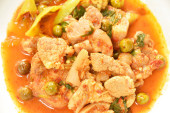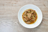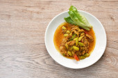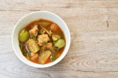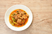 pikantny smażony kawałek wieprzowiny z bakłażan curry na talerzu