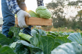 Zdjęcie "Organic farming, salad farm. Farmers harvest salad vegetables into wooden boxes in rainy. Hydroponics vegetable grow naturally. greenhouse garden, Ecological Biological, Healthy, Vegetarian, ecolog" może być wykorzystywane do celów osobistych i komercyjnych zgodnie z warunkami zakupionej licencji Royalty-free. Obraz jest dostępny do pobrania w jakości wysokiej rozdzielczości do 5760x3840.