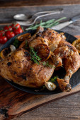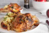 Pieczone szynki z kurczaka z ziemniakami puree, pieczone, cebula i jabłka na talerzu