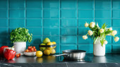 detal w kuchni z przytulnym wnętrzem, biała szafka z metalową rączką, garnek na kuchenkę elektryczną, ceramiczne słoiki i czyste miski na ciemnym blatze