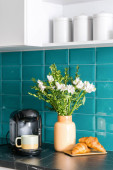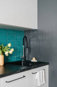 Zdjęcie "detal w kuchni z przytulnym wnętrzem, biała szafka z metalową rączką, garnek na kuchenkę elektryczną, ceramiczne słoiki i czyste miski na ciemnym blatze" może być wykorzystywane do celów osobistych i komercyjnych zgodnie z warunkami zakupionej licencji Royalty-free. Obraz jest dostępny do pobrania w jakości wysokiej rozdzielczości do 5760x3840.