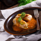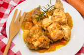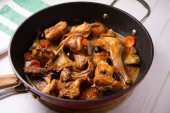 Pieczone udka z kurczaka gotowane z małży i warzyw.