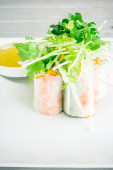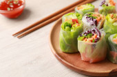 Pyszne sajgonki owinięte w papier ryżowy na białym drewnianym stole, zbliżenie
