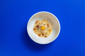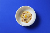 Koktajl Penicylina z pianką cytrusową i złotym liściem w szkle łodygowym stoi na gipsowej sylwetce wśród innych figur gipsowych. Wszystkie elementy są na białym tle.
