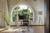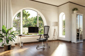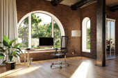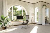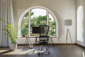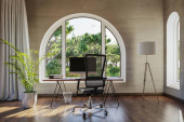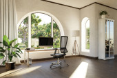 miejsce pracy ze stacją roboczą przed wysklepionymi oknami; widok na krajobraz; jasne światło słoneczne; koncepcja zdalnej pracy; ilustracja 3D
