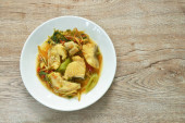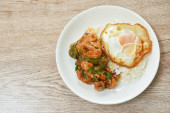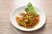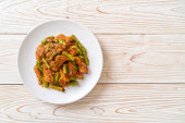 pikantny smażony kawałek wieprzowiny z bakłażan curry na talerzu