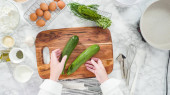 Widok z góry wytatuowana kobieta cięcia świeżego ogórka w kuchni
