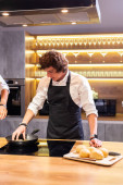 Przygotowuję pyszne hamburgery. Chef gotowania mięsa hamburgery z wołowiny, sera i warzyw